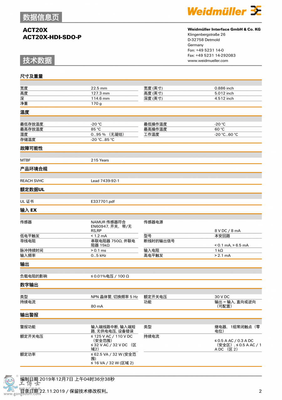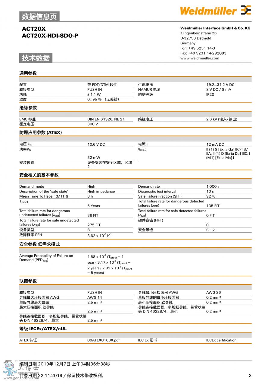 ACT20X-HDI-SDO-P 魏德米勒 防爆信號隔離轉換器 訂貨號2456070000