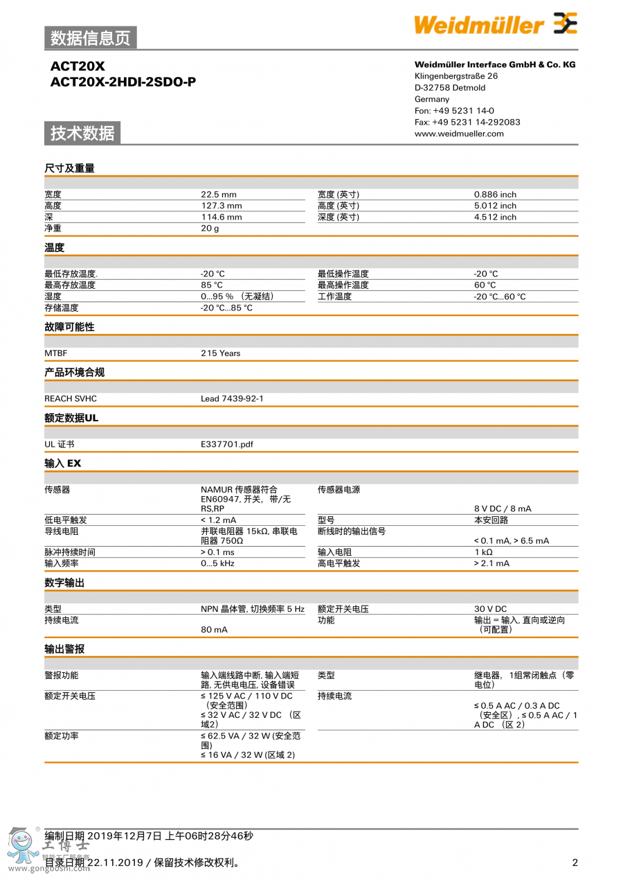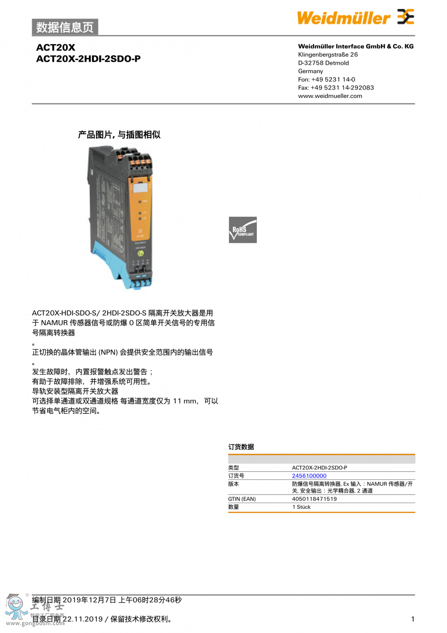 ACT20X-2HDI-2SDO-P 魏德米勒 防爆信號隔離轉換器 訂貨號2456100000