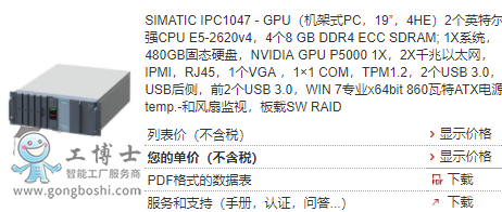 產品說明 SIMATIC IPC1047 - GPU(機架式PC,19”,4HE)2個英特爾至強CPU E5-2620v4,4個8 GB DDR4 ECC SDRAM; 1X系統,480GB固態硬盤,NVIDIA GPU P5000 1X,2X千兆以太網,IPMI,RJ45,1個VGA ,1×1 COM,TPM1.2,2個USB 3.0,2個USB后側,前2個USB 3.0,WIN 7專業x64bit 860瓦特ATX電源; temp.-和風扇監視,板載SW RAID
