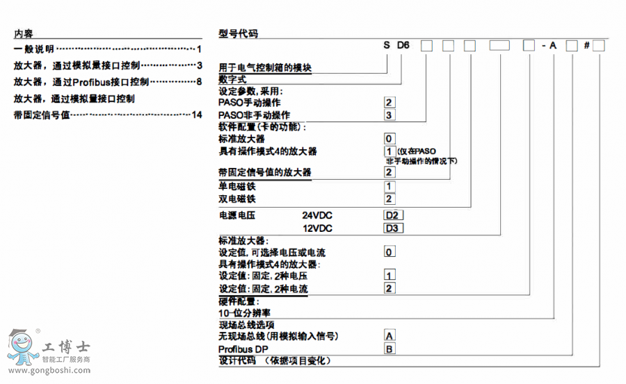 萬福樂放大器功能簡介放大器模塊可提供-路〈單電磁鐵比例闌〉或二路(雙電磁鐵比例闌〉疊加頤據信號的脈寬調制(PWM)控制電流輸出,顫振僧號的攝幅和頻率可被獨立調整.可接曼0.. 10 V,士10 v (但雙電磁鐵型)電壓輸入和10... 20mA以及 4 .. 20 mA電流輸入的設定值情號輸入,或通 過現場總統接口(Pro由bus口的接收控制信號, 升級至7個設定值信號.此外,放大器模塊還 有-路用于始能控制或作為電碰鐵B轉換控制 的開關量輸入,以及-路用于故障指示或電磁鐵A和電碰鐵B激活指示的開關量輸出。