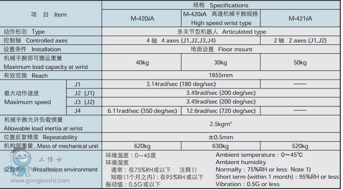 M-420iA/M-421iA特點: 1、這是一款為物流系統的機器人化做出貢獻的物流智能機器人 2、具有*大3000次/小時的搬運能力。通過活用*大50kg的可搬運能力,一次取出多個產品,從而提高搬運作業效率。 3、M-420iA/M-421iA是由搭載了多種智能化功能的新式的高性能控制器R-J3iC控制的 應用于: 物流搬運,碼垛,拾取及包裝,機床上下料 ,裝配