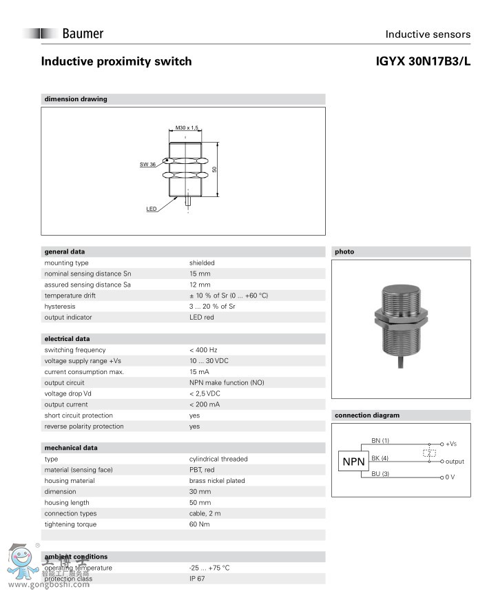 Baumer 堡盟 IGYX 30N17B3/L電感式接近開關傳感器
