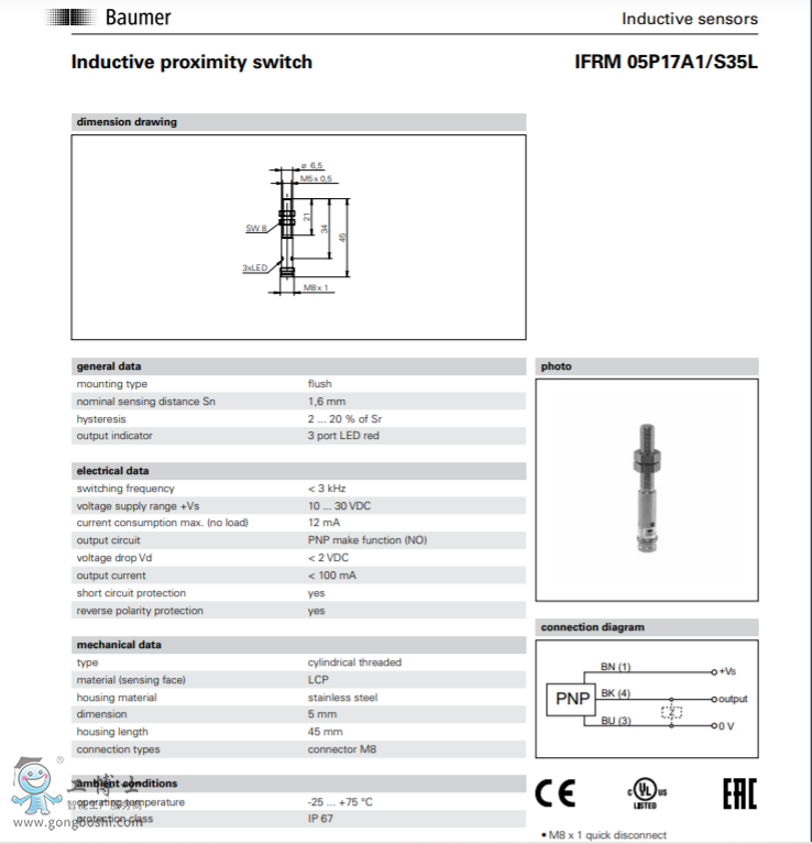 Baumer 堡盟 IFRM 05P17A1/S35L-電感式接近開關 可開增票