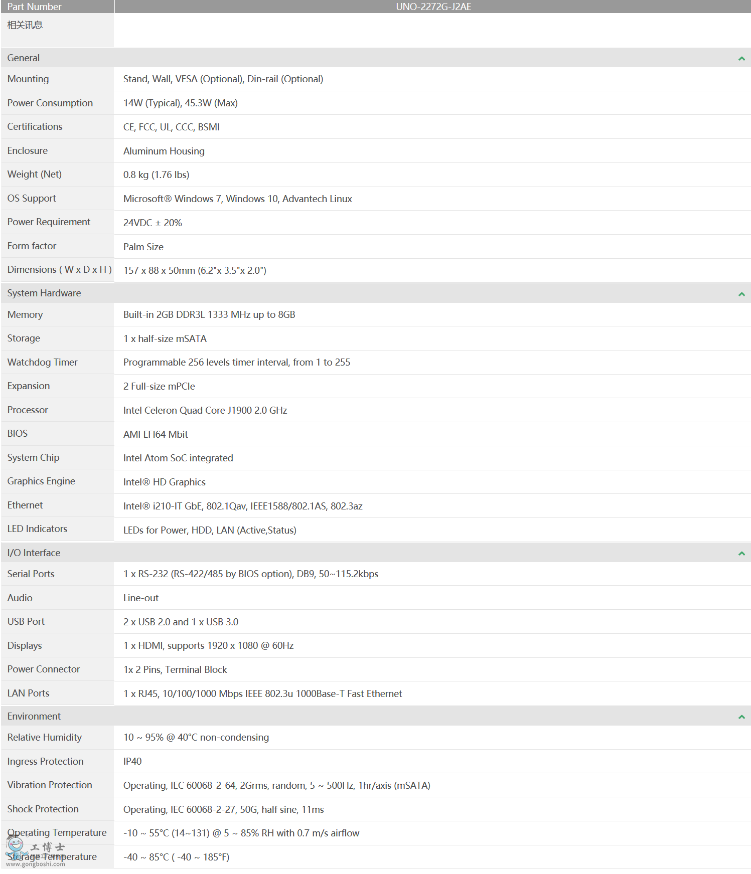 研華科技 小型智慧工廠數據網關 UNO系列 UNO-2272G Intel® Atom™處理器