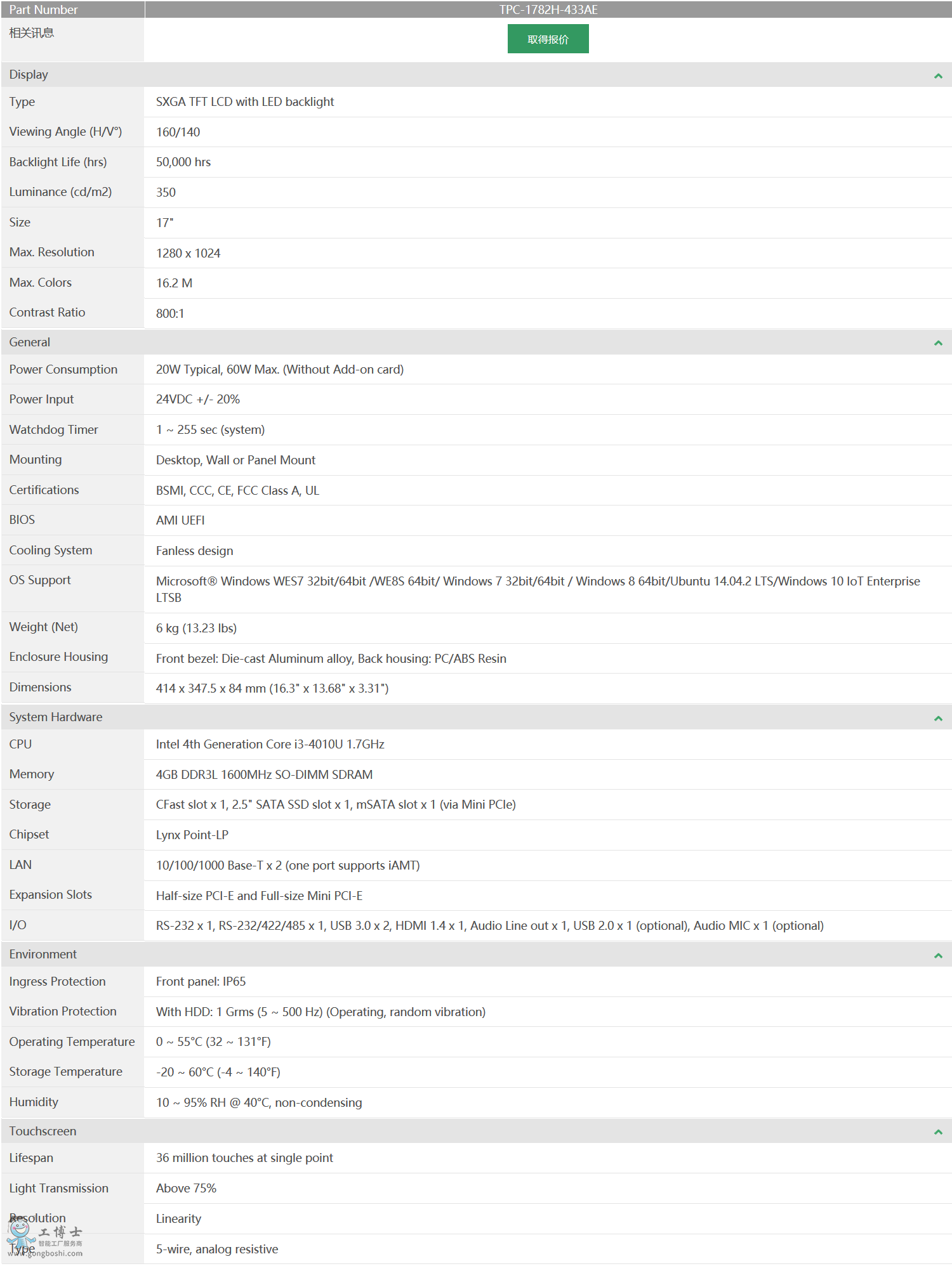 顯示器: 工業等級17寸 XGA TFT 液晶顯示器, 50,000小時LED背光壽命