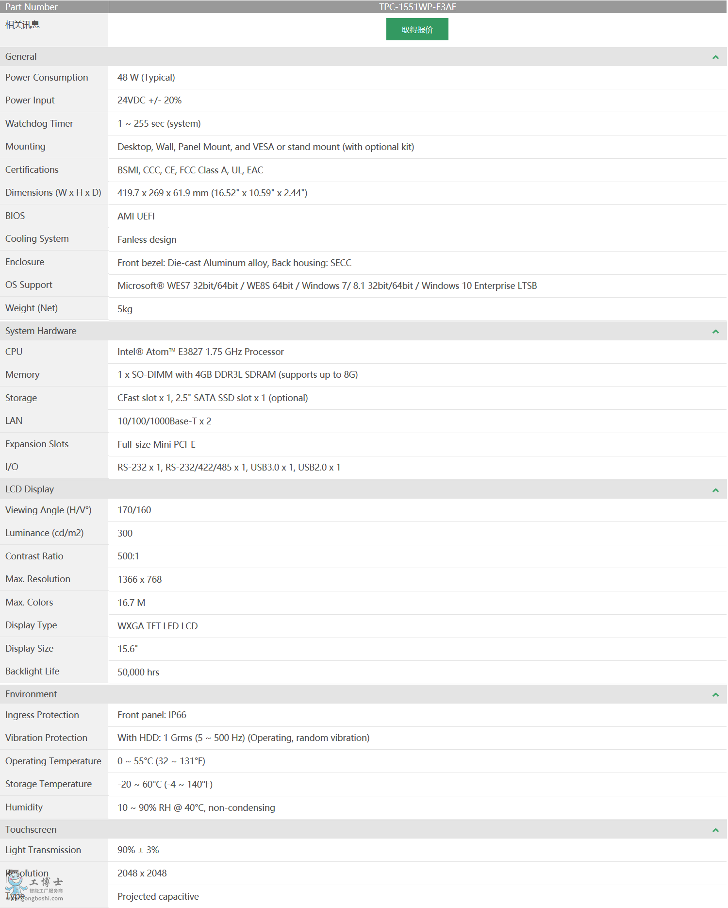 研華工控機 TCP系列高效能工業平板電腦 TPC-1551WP 英特爾® 凌動™ 處理器