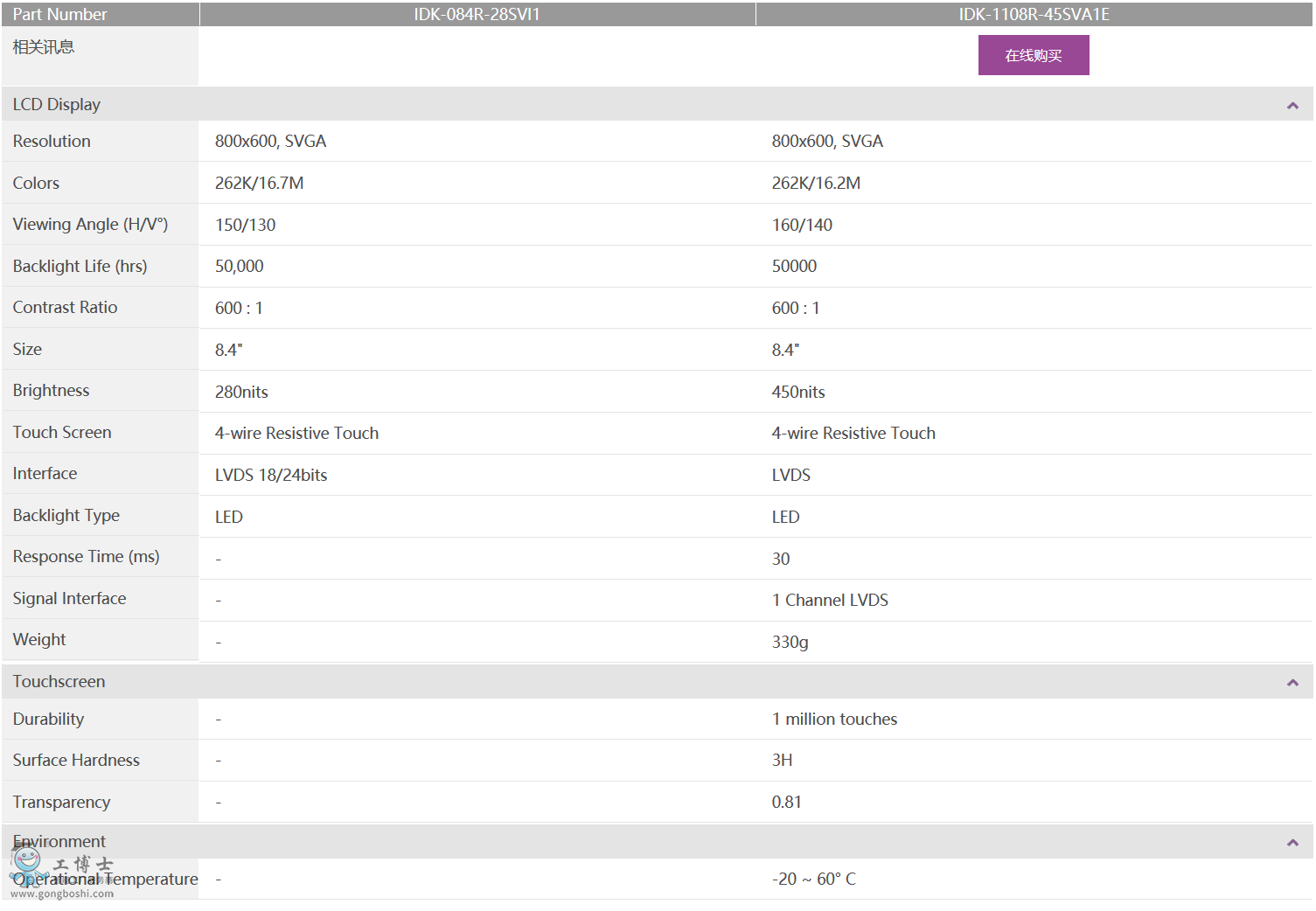 顯示參數: 8.4° LCD 支持 800 x 600 像素和寬工作溫度(-5 ~ 60°C)