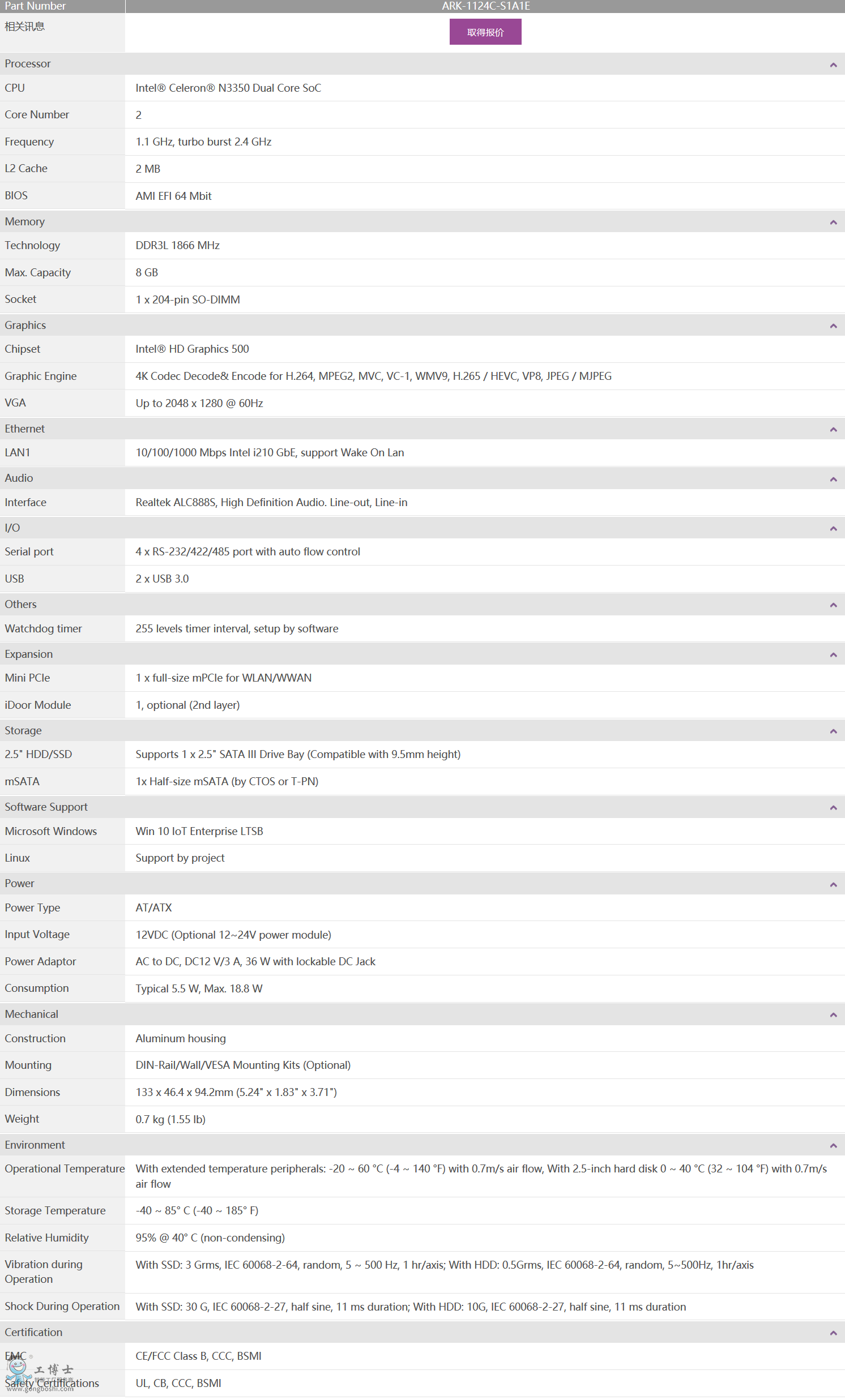 支持VGA顯示,4xRS-232/422 /485,2xUSB3.0 |