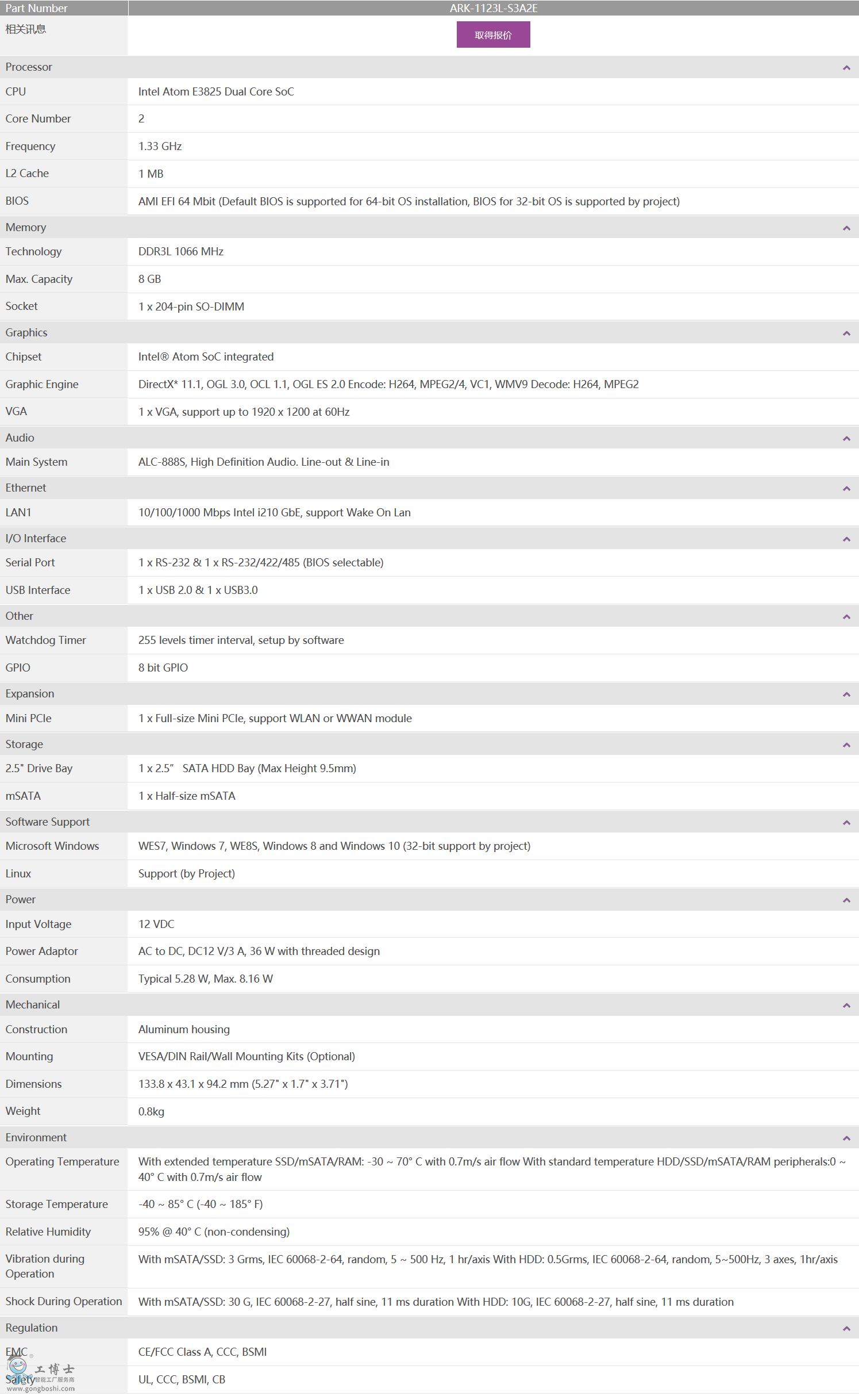 處理器: Intel® Atom™ E3825 雙核1.33 GHz 處理器