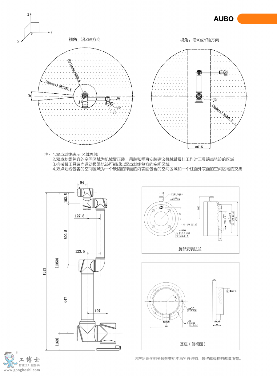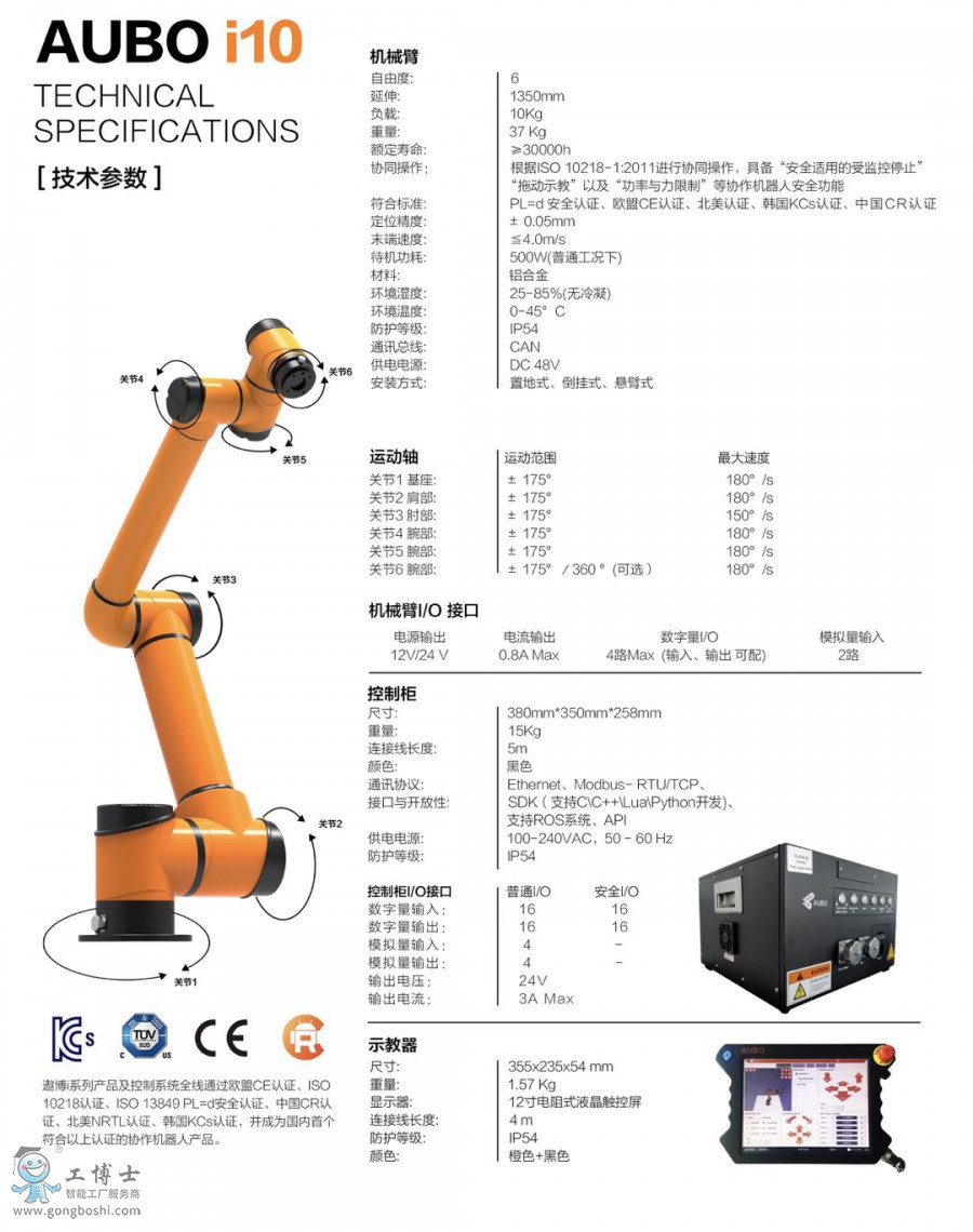 - AUBO-i10是負載*大的遨博協作機器人;- 可勝任末端負載為10kg以下的自動化作業;- 臂展為1563.2mm,可滿足工作范圍在1350mm以內的作業任務;- i10協作機器人可應用在汽車制造、金屬加工、食品、醫藥、物流等行業,實現上下料、裝配、鎖螺絲、噴粉、打磨、焊接等應用