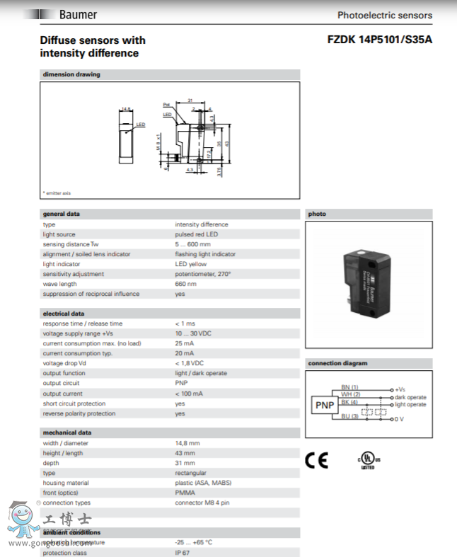 Baumer 堡盟FZDK 14P5101/S35A漫反射式光電傳感器
