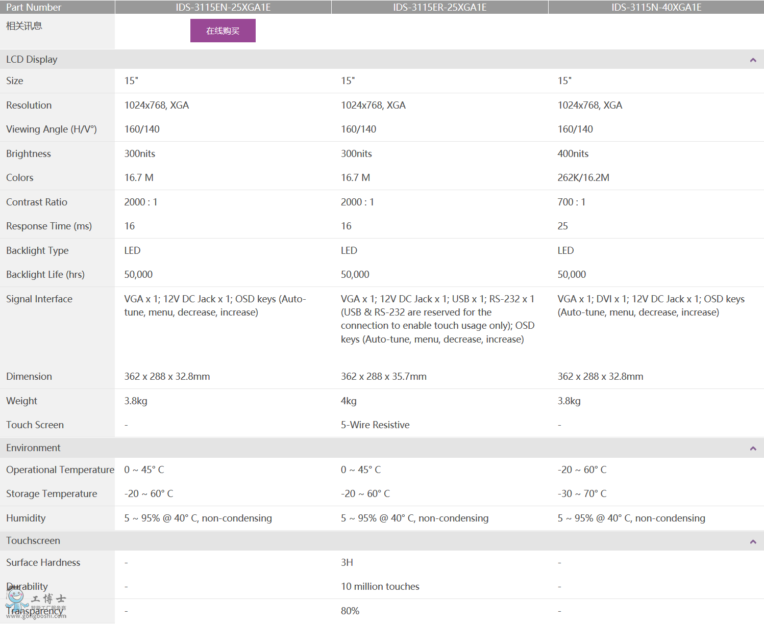 15" 1024 x 768像素 TFT LCD觸摸屏 VGA、DVI雙信號接口 開放式顯示器
