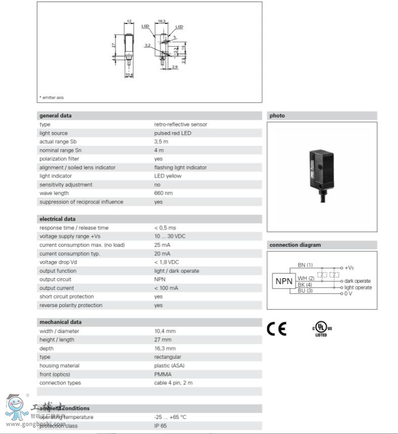 Baumer堡盟鏡反射式光電傳感器FPDK 10P5130/S35 A開增值票