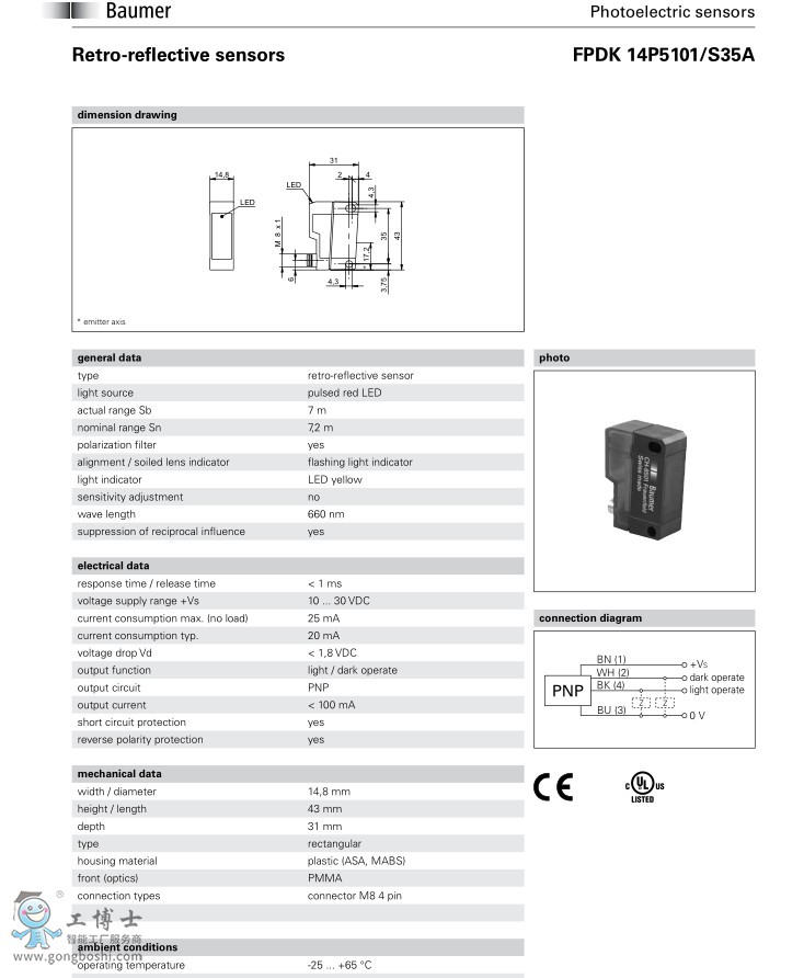 Baumer 堡盟FPDK 14P5101/S14鏡反射式光電傳感器 電眼,光電開關