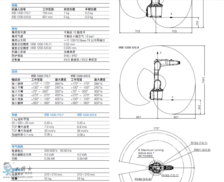 作為一個機器人系列,IRB 1200提供的兩種型號廣泛適用于各類作業。兩種型號都可選配食品級潤滑、SafeMove2、鑄造專家II代和潔凈室防護等級。這兩種型號的工作范圍分別為700 mm和900 mm,*大有效負載分別為7 kg和5 kg。