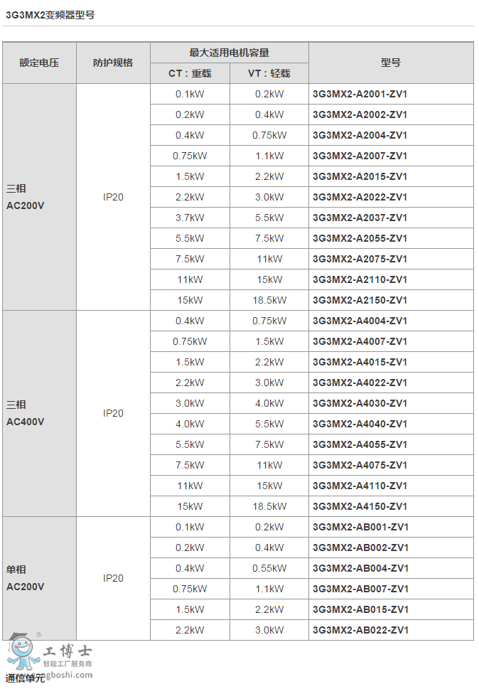 3G3MX2-A2002-ZV 簡介:OMRON 歐姆龍多功能小型變頻器,三相AC200V,重載0.2KW,輕載0.4KW,防護(hù)等級(jí)IP20。