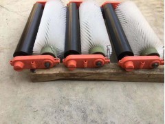 結構特點:旋轉式清掃器是根據目前普遍使用的清掃器存在的缺陷改進設計的新產品。其特點如下:1.一體化設計,安裝、調整方便,適用性強;2.清掃過程中不會造成膠帶跑偏現象;3.安全可靠、使用壽命長、維修費用低;4.清掃器工作時,清掃點連續接觸,清掃有力,清掃效果好;5.尼龍刷經過特殊工藝加工制作,不粘料、不結垢;6.對膠帶無磨損,延長膠帶使用壽命。
