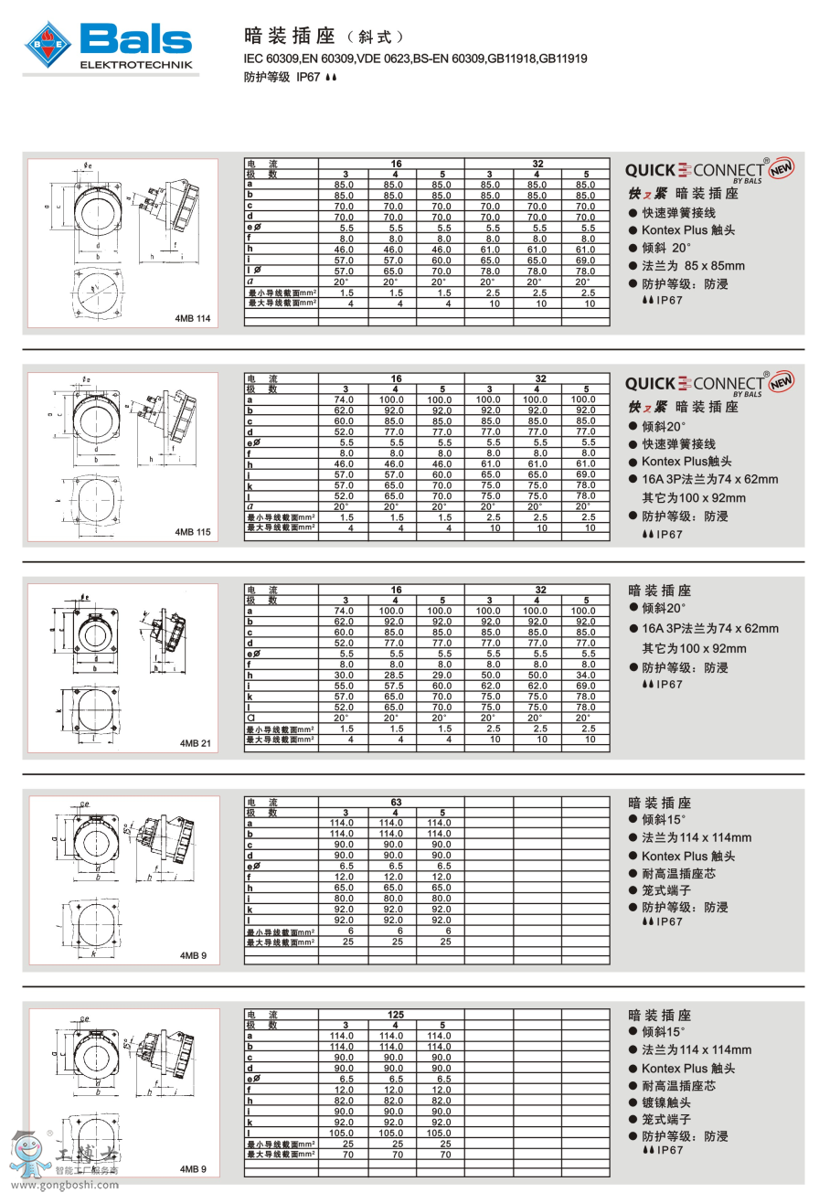 德國霸士Bals 暗裝斜插插座 16A /4P / IP67 BS12832工業防水插座