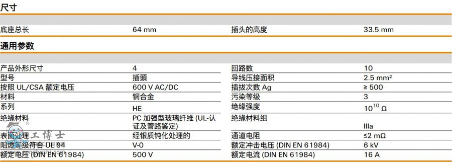 版本 HDC - 插芯, 插頭, 500 V, 16 A, 回路數: 10, 彈片聯(lián)接, 產品外形尺寸: 4