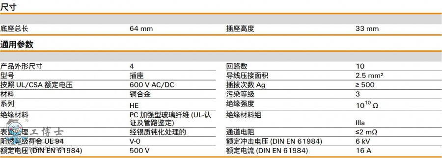 版本 HDC - 插芯, 插座, 500 V, 16 A, 回路數(shù): 10, 彈片聯(lián)接, 產(chǎn)品外形尺寸: 4