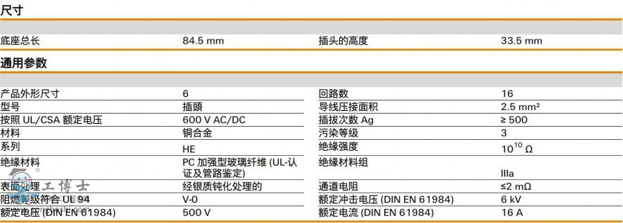 版本 HDC - 插芯, 插頭, 500 V, 16 A, 回路數: 16, 彈片聯接, 產品外形尺寸: 6
