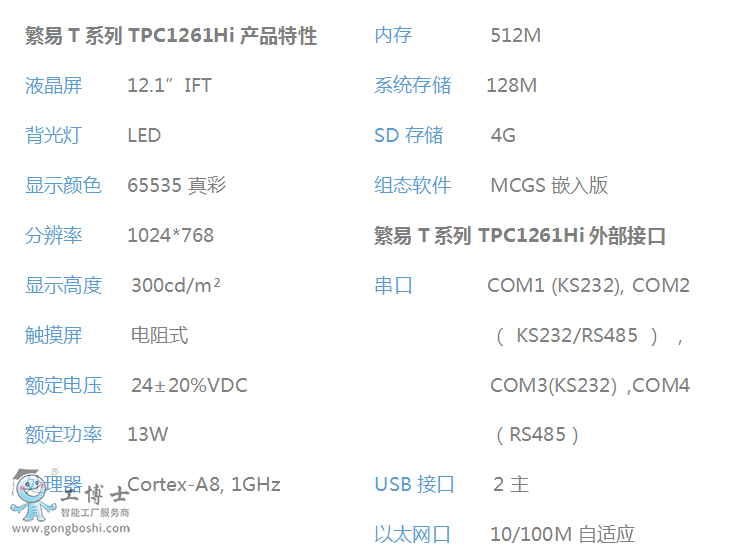 TPC1261Hi,是一套以先進的Cortex-A8 CPU為核心(主頻1GHz)的高性能嵌入式一體化觸摸屏。該產品設計采用了12.1英寸高亮度TFT液晶顯示屏(分辨率1024×768),四線電阻式觸摸屏(分辨率4096×4096),以及具有良好的電磁屏蔽性,美觀堅固的鋁合金結構。同時還預裝了MCGS嵌入式組態軟件(運行版),具備強大的圖像顯示和數據處理功能。