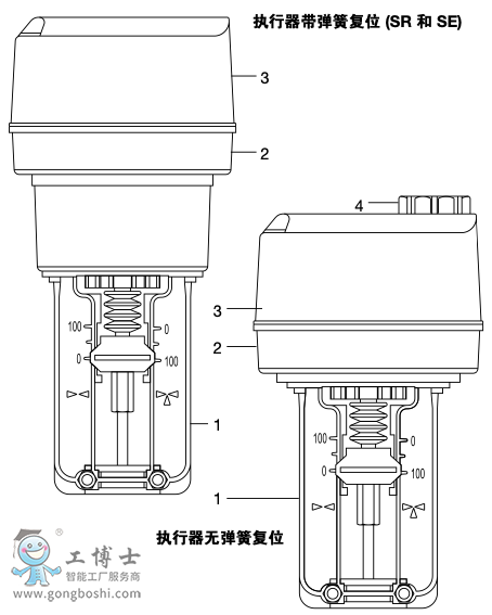 EL3500系列執(zhí)行器可供型號(hào)如下所述: 帶有預(yù)制彈簧的執(zhí)行器在基本型號(hào)后加SR或SE,例如EL3501SE。