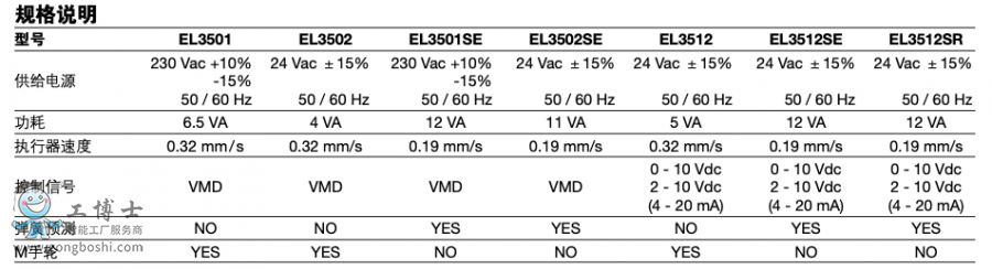 EL3501,230Vac電壓,用于開(kāi)/關(guān)控制或帶外置VMD控制器的調(diào)節(jié) 控制。 EL3502,24Vac電壓,用于開(kāi)/關(guān)控制或帶外置VMD控制器的調(diào)節(jié) 控制。EL3501SE,230Vac電壓,用于開(kāi)/關(guān)控制或帶外置VMD控制器的調(diào) 節(jié)控制,失電后閥門關(guān)閉。 EL3502SE,24Vac電壓,用于開(kāi)/關(guān)控制或帶外置VMD控制器的調(diào)節(jié) 控制,失電后閥門關(guān)閉。 EL3512,EL3512SR,,EL3512SE,24Vac電壓,0-10Vac或 2-10Vdc控制信號(hào)。對(duì)于4-20mA控制信號(hào),接一只500歐電阻至信 號(hào)源上。