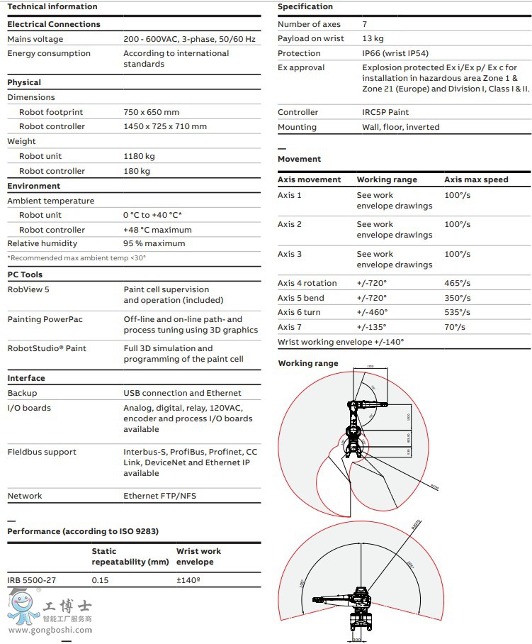 IRB 5500-27 是創新 IRB 5500 機器人系列的新變種。IRB 5500-27 集成的 7 軸,可實現更寬的工作范圍和靈活的安裝定位,能夠支持車內和外部汽車噴漆以及其他油漆應用。