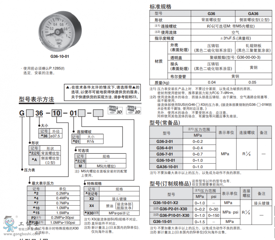 SMC壓力表 一般用壓力表 帶限位指示器 G36系列 G36-4-01