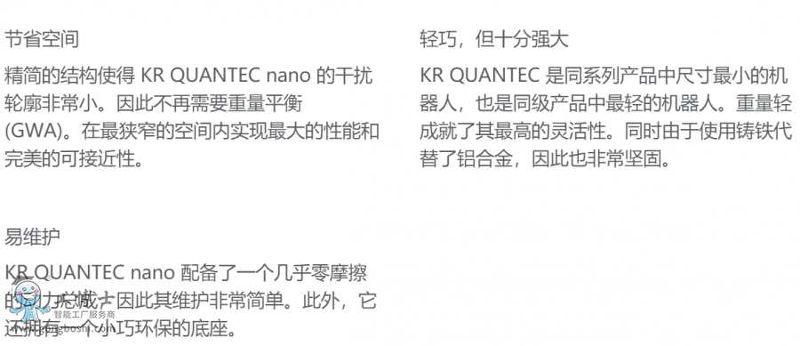 KR QUANTEC nano 是 KR QUANTEC 系列中輕巧、緊湊的機器人。這款機器人特別適合用于點焊并能以低的投資成本帶來佳的工藝結果。