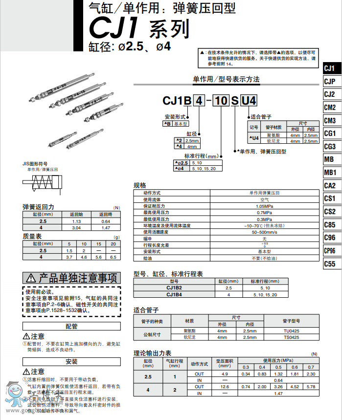 SMC氣缸 單作用 彈簧壓回型 CJ1B2-10SU4