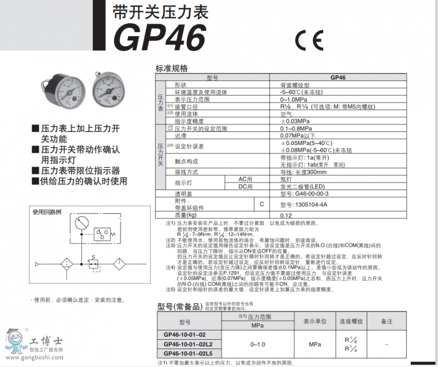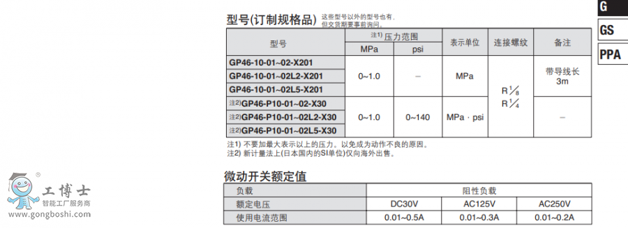 SMC帶開關(guān)壓力表 GP46系列 GP46-P10-01~02L2-X30