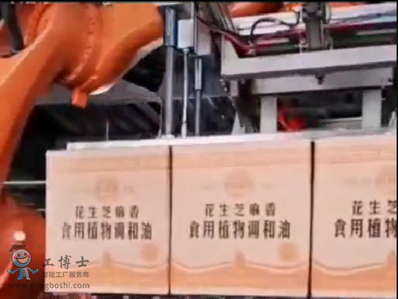 庫卡機器人在拾取紙箱后自動化堆垛并確保均勻放置上下碼垛,從而避免產品落下或托盤放歪。
