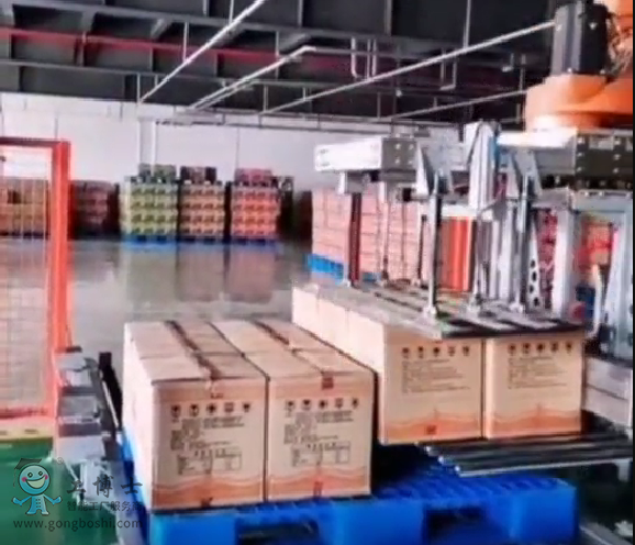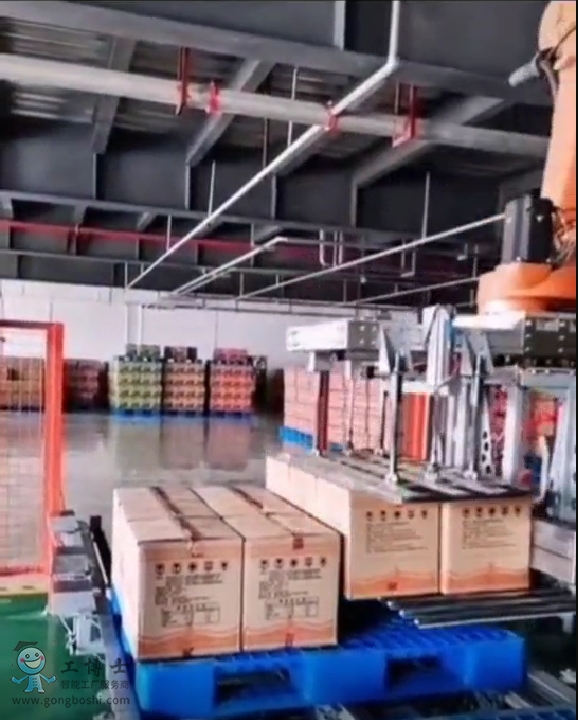 庫卡機器人從輸送系統拾取紙箱,并按照一定樣式將其碼垛在準備好的托盤上。