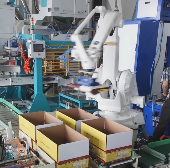 機(jī)器人通過(guò)安裝的真空吸盤將食品袋吸起,將其運(yùn)向紙箱