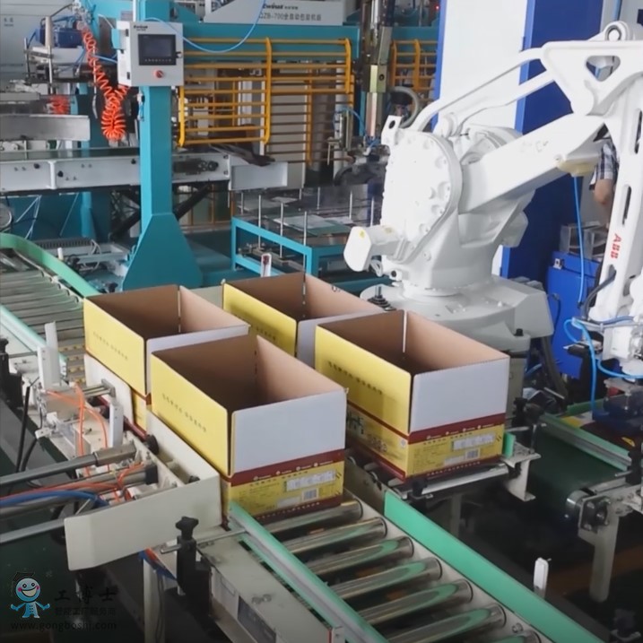 機(jī)器人將吸取的食品袋以規(guī)定的軌跡運(yùn)向傳送帶上的紙箱中,將其放入紙箱。