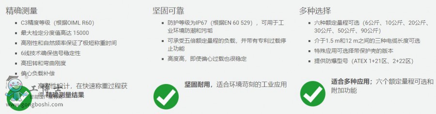 PW22具有極高的剛度,因此具有極高的自然共振頻率。這確保了較低的穩定時間,進行快速成長。精度等級C3,確保測量結果***可靠。內置五倍額定量程的過載保護,可防止意外導致傳感器損壞。6個額定量程在6kg 到 90kg 之間,不同電纜長度可選,并可為苛刻的操作條件,提供 ATEX 防爆版本和帶保護殼型號。