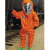 雷克蘭ICP640 全封閉氣密型防化服,通過了EN943 Type 1a測試,前入式設計,門襟采用氣密型拉鏈,邊縫采用內外雙層熱合膠帶焊縫結構,配合雙層魔術搭扣,40mil厚的特大加寬PVC軟質面屏外涂敷10mil厚的特氟隆防化涂層,手部采用3層手套防護系統。