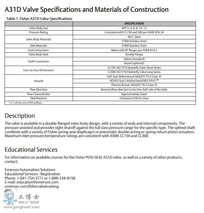 Fisher A31D 是一款雙法蘭高性能蝶閥,采用花鍵驅動軸或平鍵驅動軸。 A31D 用于節流或開/關應用,型號包括 NPS 3 至 12、CL150 和 CL300。
