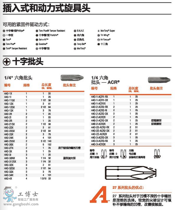 27系列批頭對于凹槽不深的十字螺絲是理想的選擇。較寬的***設計可填補不夠***的凹槽,改善接觸面。
