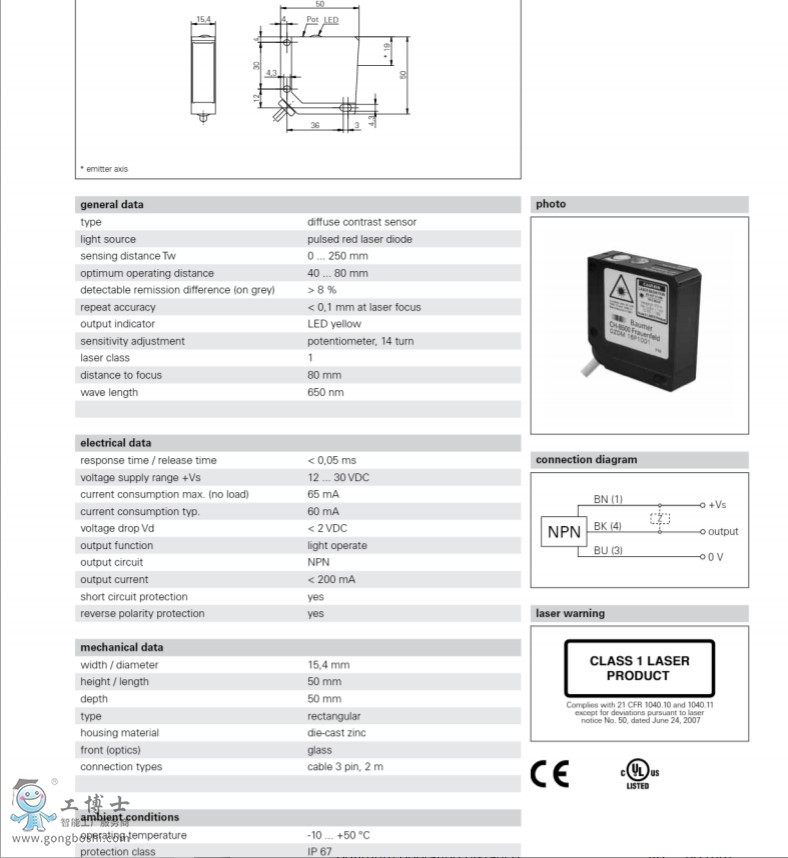Baumer 堡盟OZDM 16P1001漫反射式光電傳感器開關傳感器