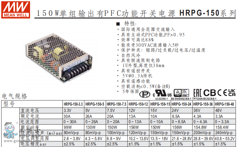 明緯PFC150-3.3V功能開關(guān)電源現(xiàn)貨