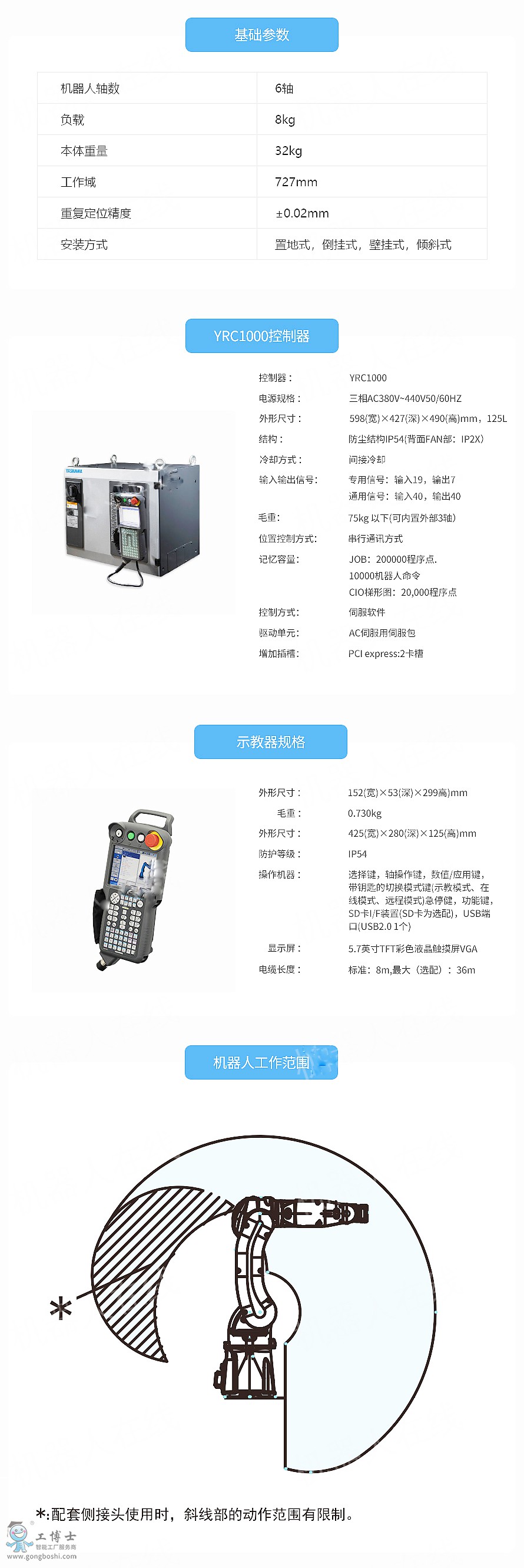 生產效率大幅度提升 ●合成速度比原有機型提升約30% 實現節拍時間縮減 ●采用了減小手臂與周邊設備的干涉的設計 ●大負載可實現多個領域的搬運 ●采用中空手臂構造,可將傳感線纜以及氣體管道內置其中 抗干擾的堅固構造 ●機器人手腕部分采用IP67標準 ●可對應接頭基座面向下引出 提升維護性 ●減少了機器人與控制柜間的電纜線數,提升了維護性的同時提供簡潔的設備 ● 大幅度縮減電纜定期更換作業時間