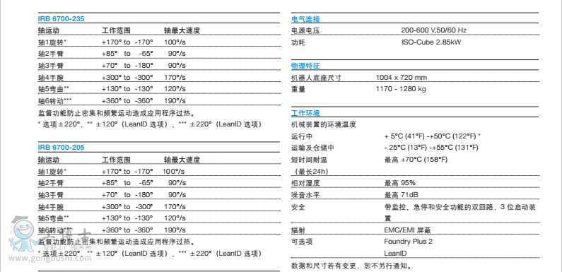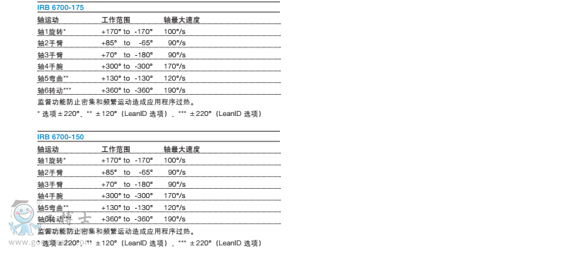 具體型號有:IRB6700-200/2.6 IRB6700-155/2.85 IRB6700-235/2.65 IRB6700-205/2.8 IRB6700-175/3.05 IRB6700-150/3.2