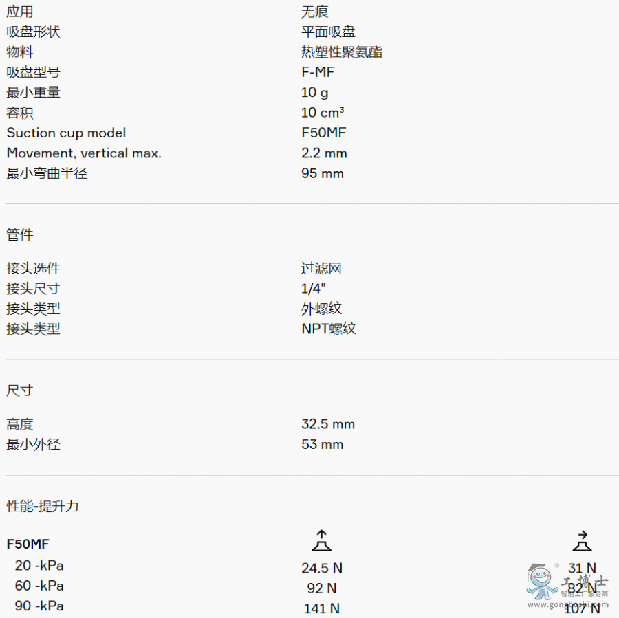 PIAB(派亞博)0101787 無痕平面吸盤F50MF 尺寸:1/4“NPT外螺紋,帶篩網過濾器