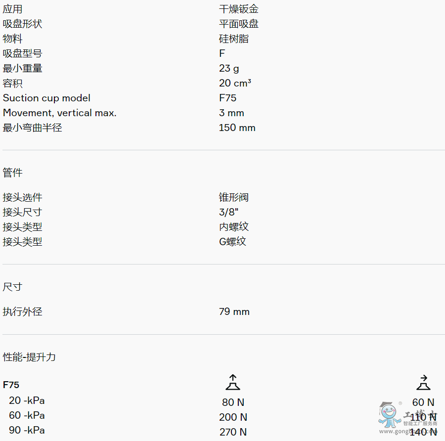 適用于硬紙板、鈑金、玻璃和多孔材料等平坦工件。該吸盤采用夾板結構,不僅可防止工件被吸入吸盤內部而導致變形,而且在提升力平行作用于工件表面時還能增加摩擦力。產品穩定性好,在工作期間幾乎不會發生任何偏移。
