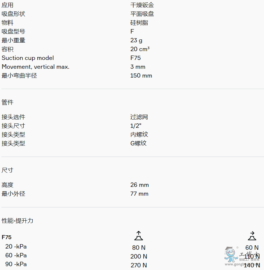 適用于硬紙板、鈑金、玻璃和多孔材料等平坦工件。該吸盤采用夾板結構,不僅可防止工件被吸入吸盤內部而導致變形,而且在提升力平行作用于工件表面時還能增加摩擦力。產品穩定性好,在工作期間幾乎不會發生任何偏移。