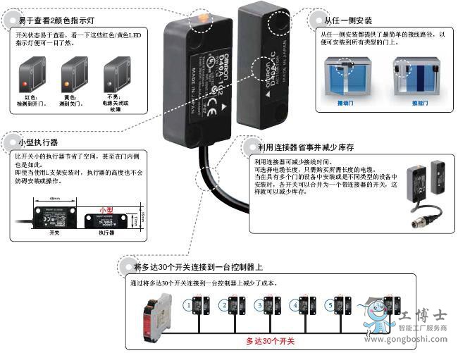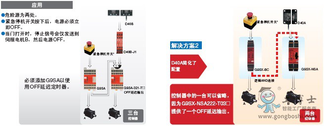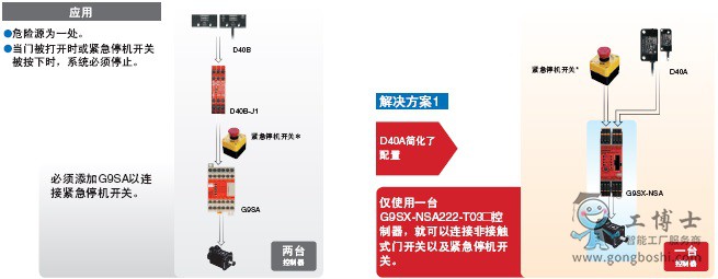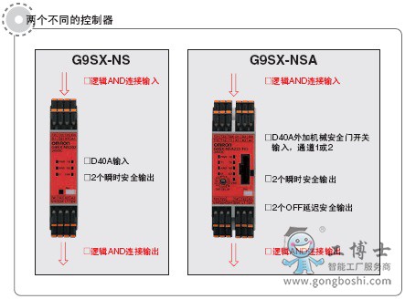G9SX-NS和G9SX-NSA專門設計為與非接觸式門開關一起使用,且使用G9SX-NSA您還可以連接機械安全門開關。在其它功能中,這些控制器支持能夠進行部分停止的邏輯AND連接。這些控制器***大限度地利用了D40A開關。