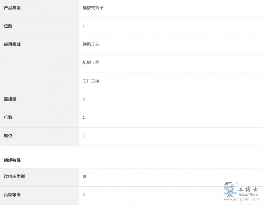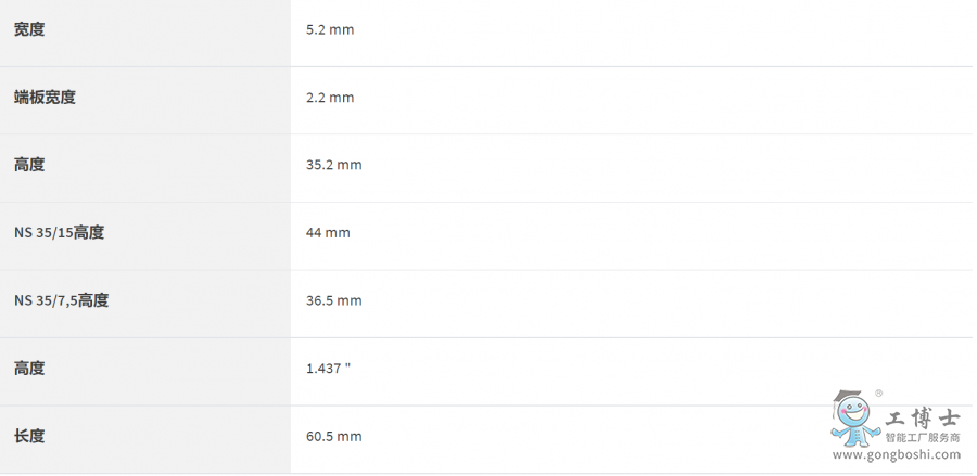 電流和電壓取決于所用的連接器。, 標(biāo)稱工作電壓: 500 V, 額定電流: 24 A, 接線方式: 插拔式 / 插件連接, 額定接線容量: 2.5 mm2, 橫截面: 0.14 mm2 - 4 mm2, 安裝方式: NS 35/7,5, NS 35/15, 顏色: 灰色